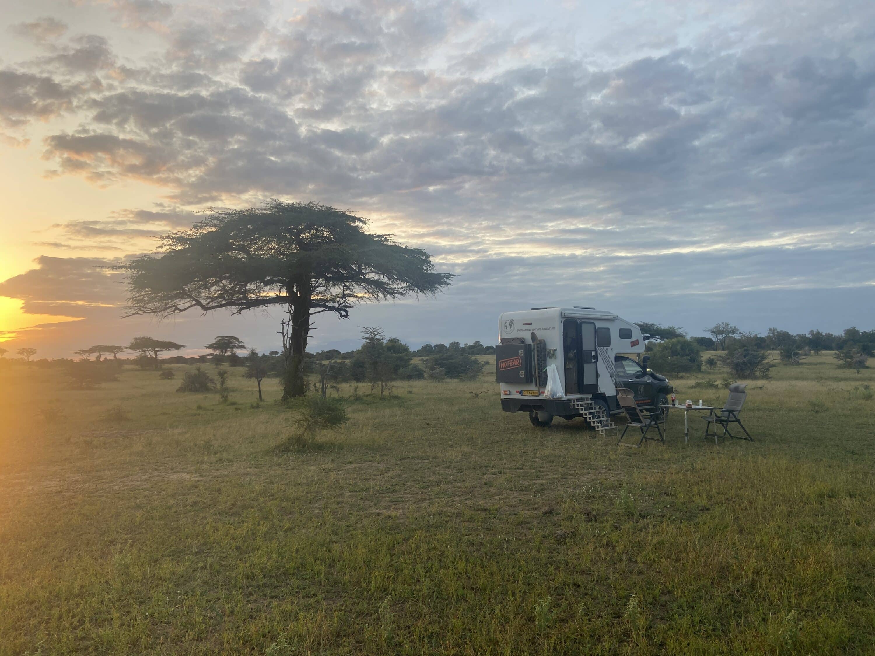 Helaas laten onze navigatiesystemen ons volledig in de steek. Wegen die op de kaart staan, bestaan niet, en bestaande paden zijn nergens op het scherm te vinden. We moeten naar een geboekte kampeerplek, maar vanaf deze kant blijkt die onbereikbaar: een diepe rivier blokkeert de doorgang, en deze is écht niet doorwaadbaar. We bedenken zelf een alternatieve route, maar dat zou zeker nog een uur duren en over een halfuur is het donker. We nemen een besluit: we blijven hier. Midden op de savanne, met een adembenemend 360-graden uitzicht, maken we ons kamp voor de nacht. We genieten in stilte van een prachtige zonsondergang. Daarna trekken we ons terug in de camper: beter geen risico nemen met nachtelijk jagende roofdieren.