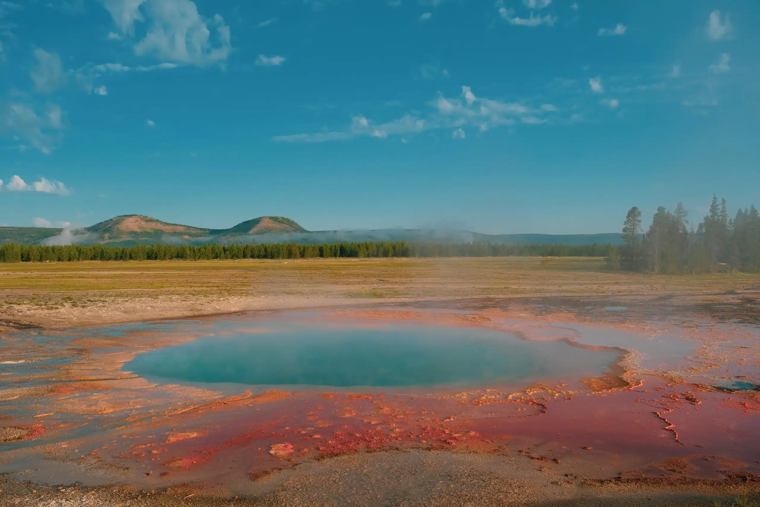 グランド プリズマティック ホット スプリングは、世界で最も有名な温泉です。 手入れの行き届いた遊歩道を散策できます。 ここは大変混雑するので、早朝か夕方に行ってください。 日中は、天候や太陽の位置によって、光源に見える色が変化します。